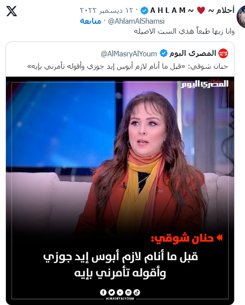 وأعلنت أحلام في تغريدة نشرتها عبر حسابها الشخصي تأييدها لتصريحات متلفزة للفنانة المصرية حنان شوقي،وتقول له “بماذا تأمرني؟”.