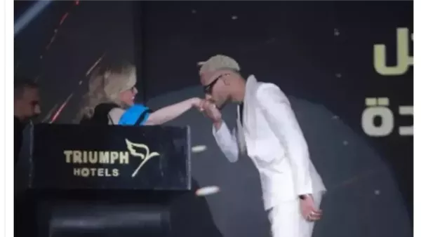من جانبه، قام رمضان بالنزول من على المسرح والصعود مجددًا، كما قام بتقبيل يدها امام الجميع.